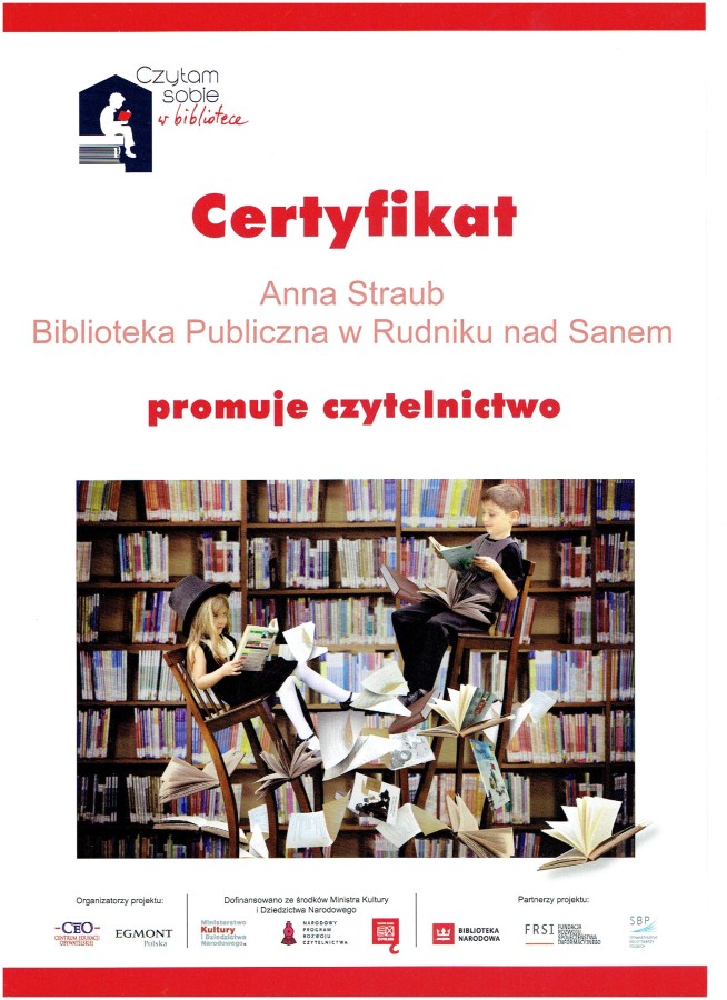 Za udział w projekcie „Czytam sobie w bibliotece” Centrum Edukacji Obywatelskiej i Wydawnictwa Egmont, Bibliotekarki koordynujące projekt otrzymały imienne certyfikaty, potwierdzające promowanie czytelnictwa.