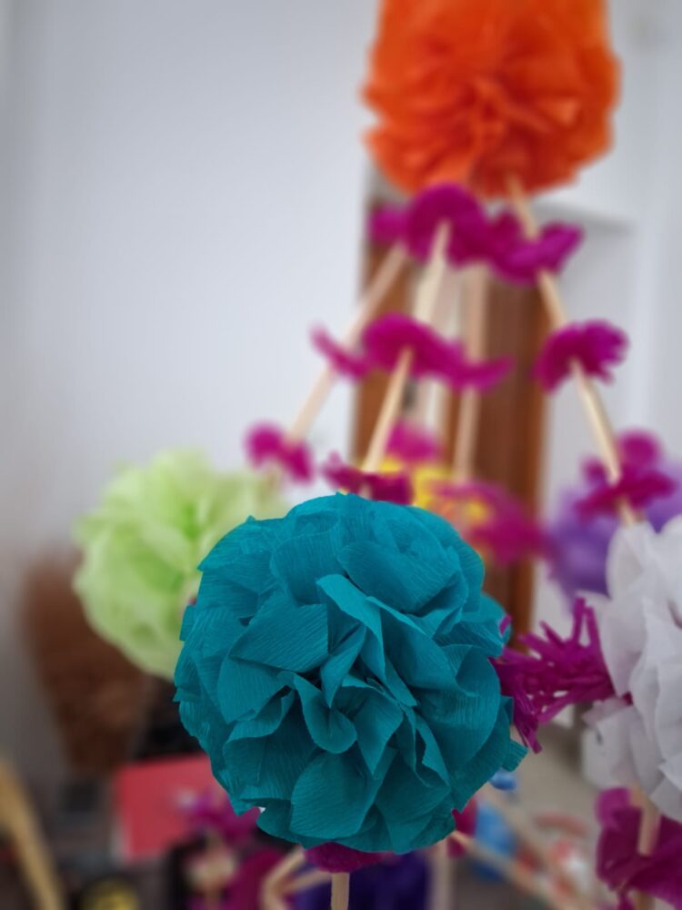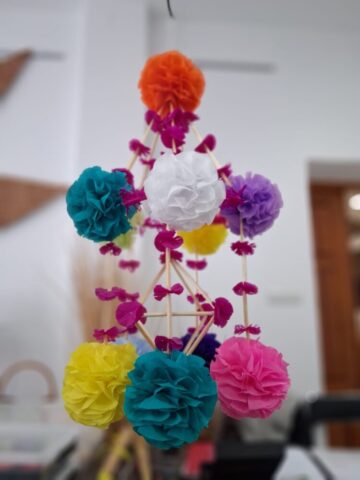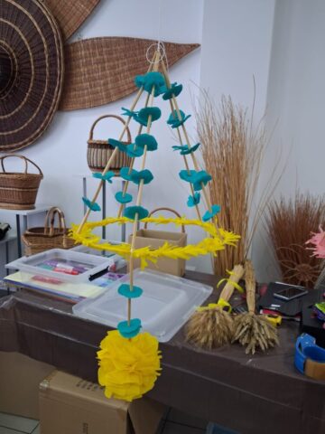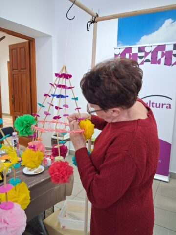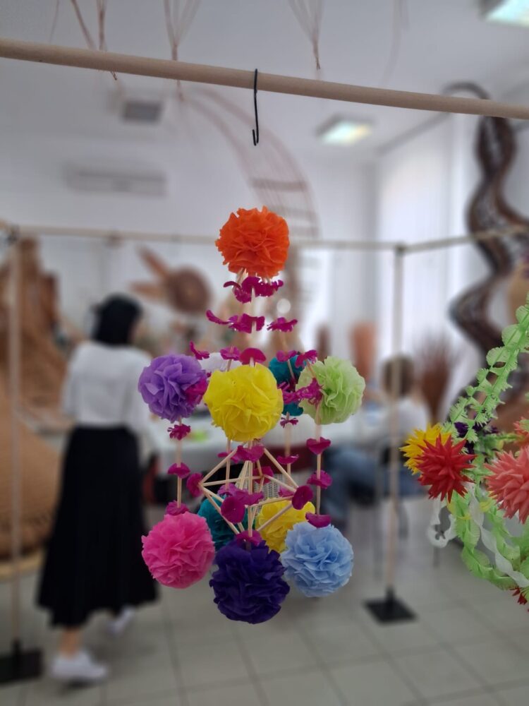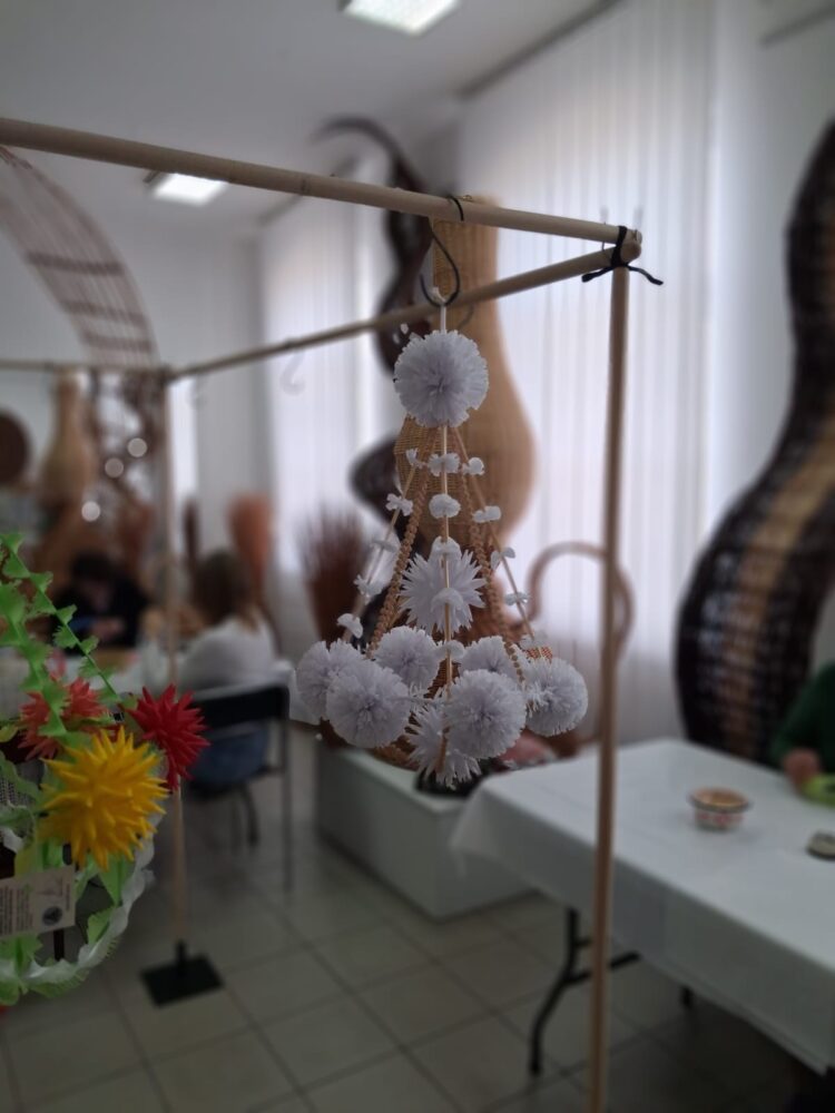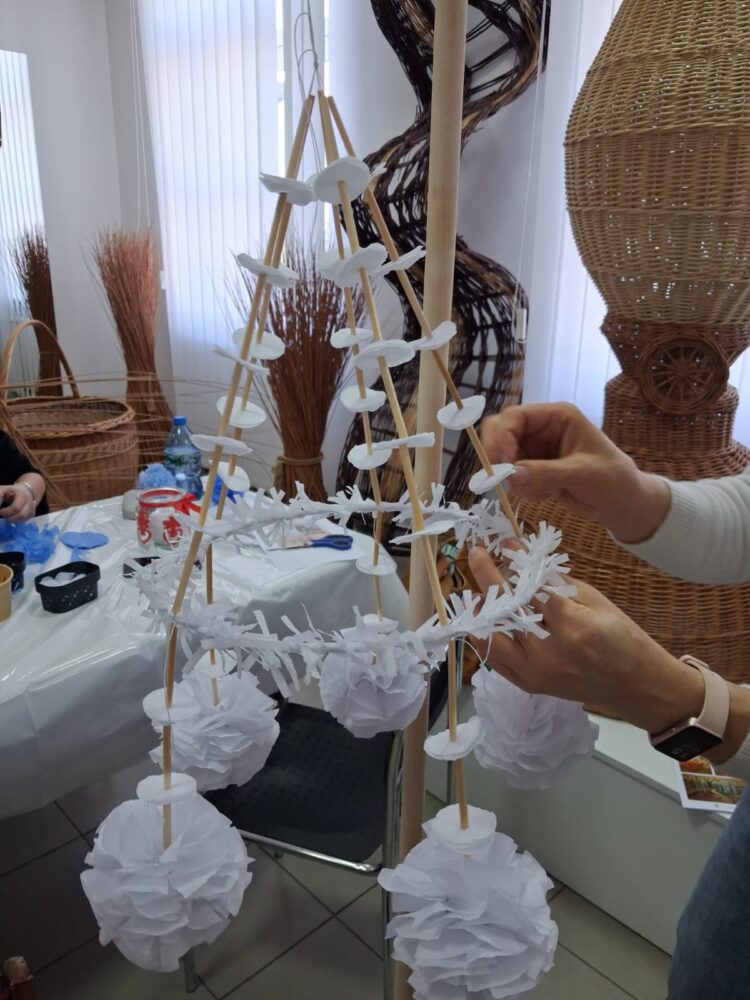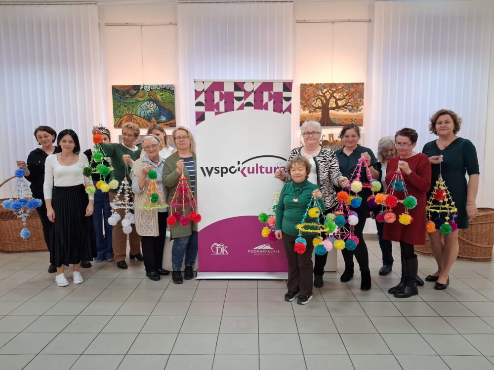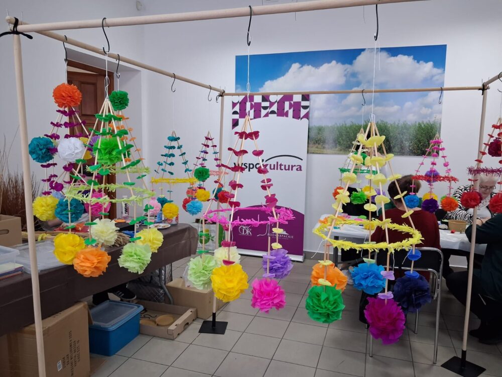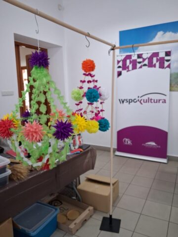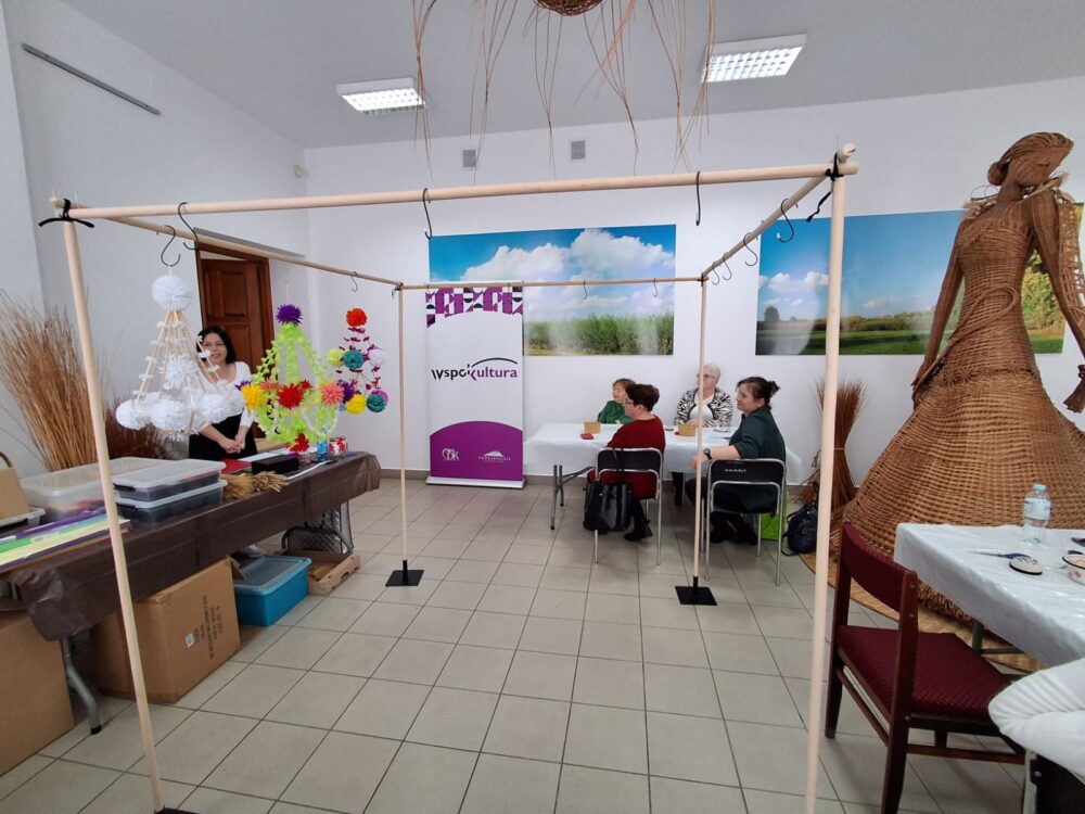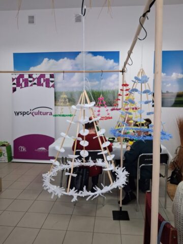Drugą część dnia stanowiły warsztaty tworzenia pająków ludowych, prowadzone przez panią Dorotę Lewkowicz. Uczestniczki poznały ich historię, a następnie samodzielnie wykonywały pająki żyrandolowe z wykorzystaniem bibuły oraz naturalnych materiałów, takich jak groch czy słoma.