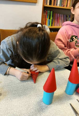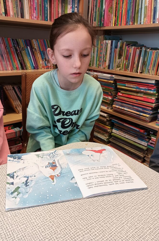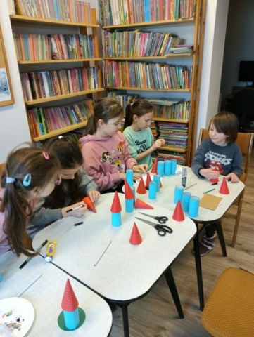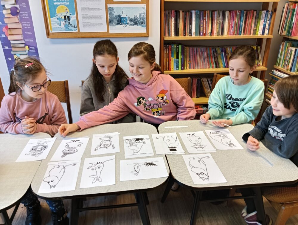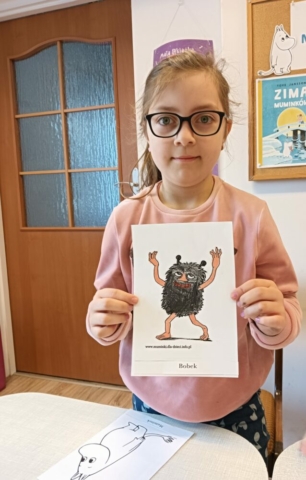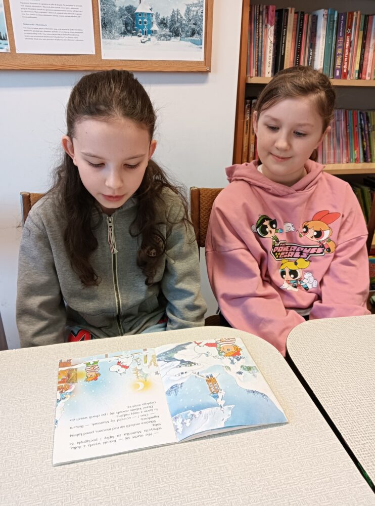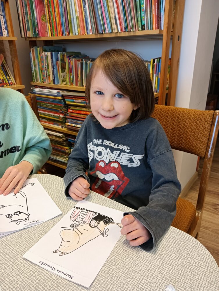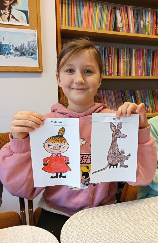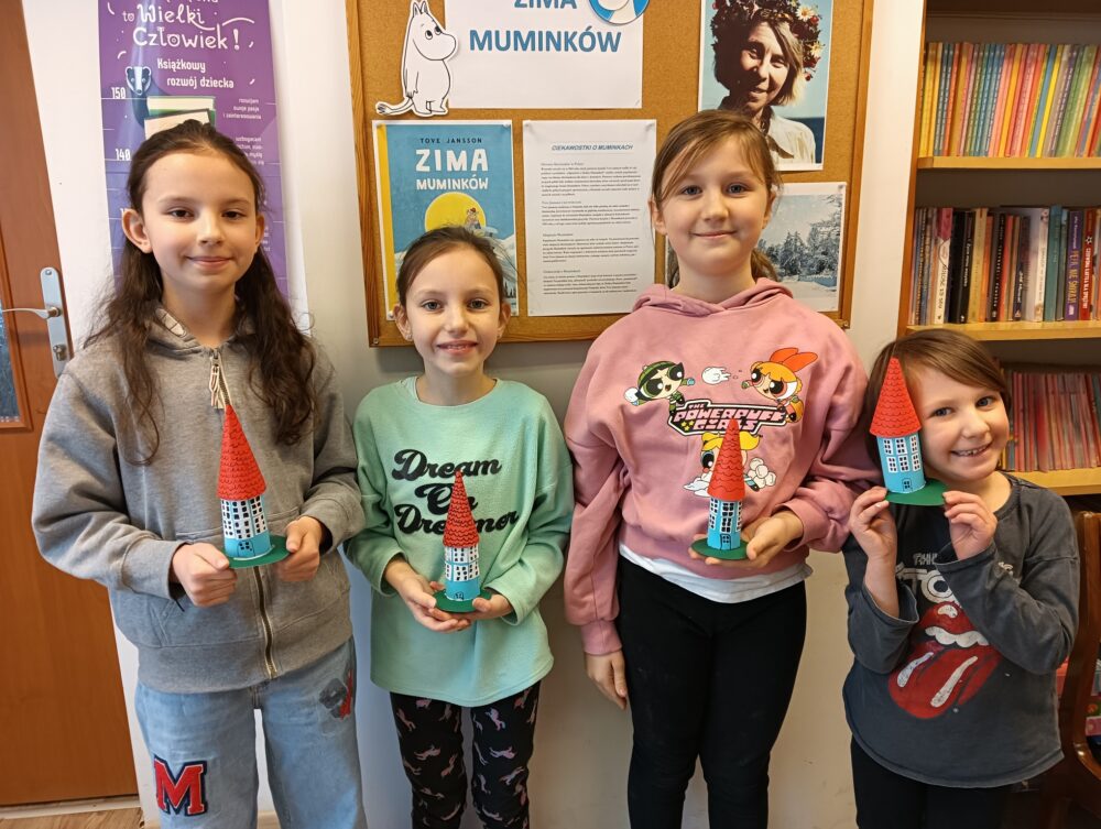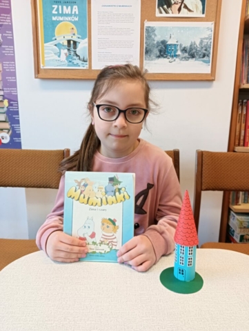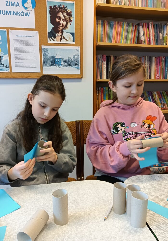 20.02.2025r. w pierwszym tygodniu ferii filia biblioteczna w Kopkach zorganizowała zajęcia w oparciu o książkę „Muminki. Zima i czary” autorstwa Tove Jansson. Małe czytelniczki podczas czytania opowieści dowiedziały się co zrobił Muminek, gdy przebudził się z zimowego snu oraz kogo spotkał w lesie, a następnie poznały wszystkich przyjaciół tytułowego bohatera poprzez dopasowanie imion postaci do kolorowanek. Uczestniczki zajęć wzięły również udział w warsztatach, podczas których wykonały niebieskie domki Muminka z wykorzystaniem recyklingu.