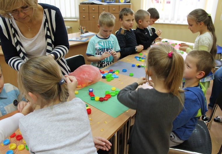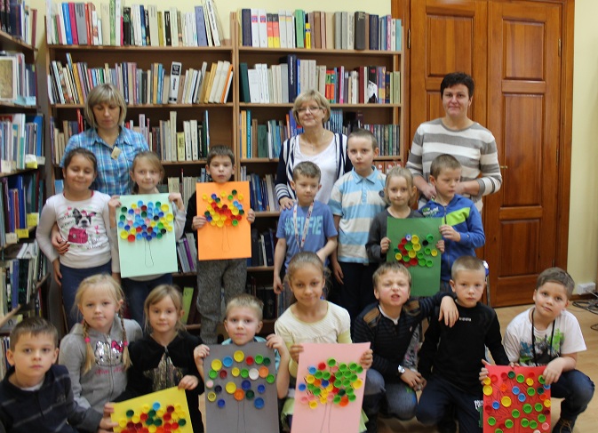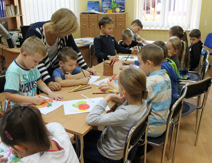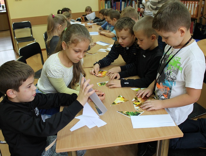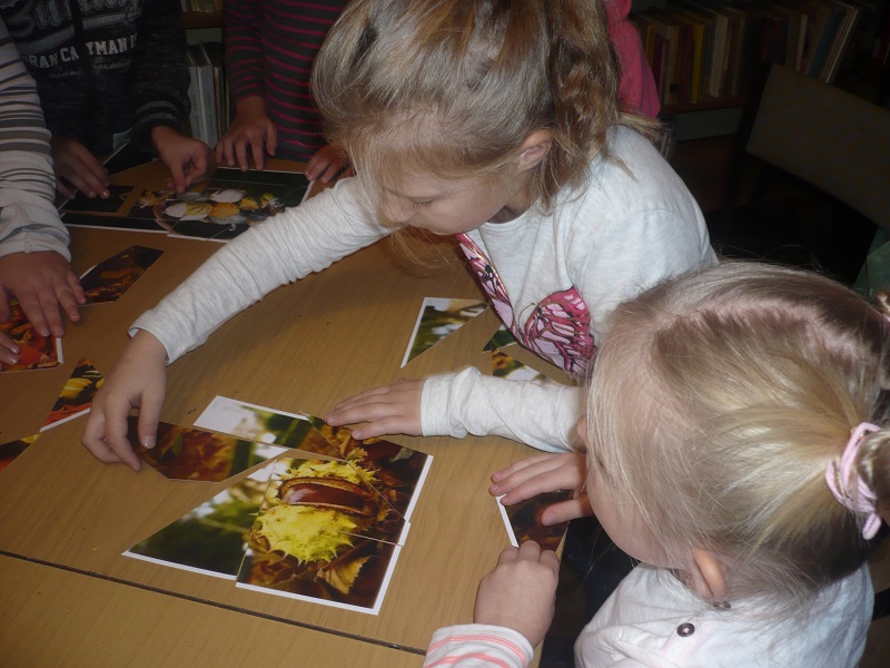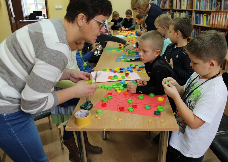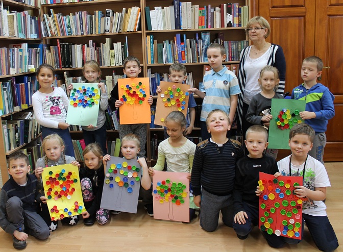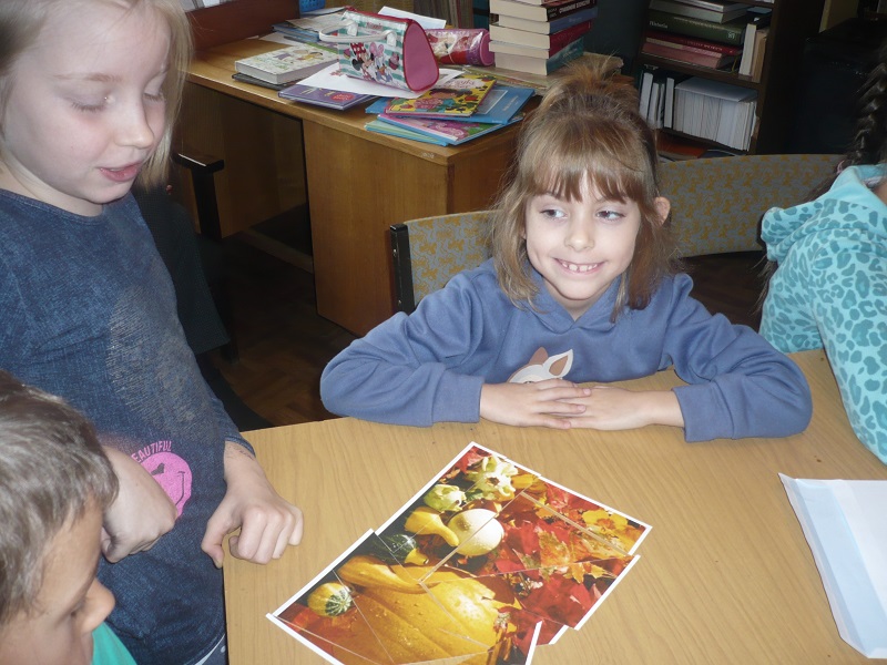 Tym razem gościliśmy kl.I z PSP nr 1 z p. Renatą Ochał oraz kl.II i III z PSP w Przędzelu z p. Małgorzatą Fluda. Wstępem do zajęć były zagadki o zwiastunach jesieni, które możemy zauważyć w przyrodzie. Zajęcia zostały też urozmaicone działaniami plastycznymi. Tym razem naszą propozycję były ekodrzewka wykonane z plastikowych nakrętek w kolorach jesiennych oraz domalowanie Pani Jesieni jej atrybutów. Uczniowie mieli możliwość rozwijania własnej aktywności i spostrzegawczości poprzez układanie puzzli i rozsypanek obrazkowych. Dodatkowo cenną zaletą tych wizyt jest wypożyczanie książek do domu, które można wymienić na następnych spotkaniach, kształtując w ten sposób postawę świadomego i odpowiedzialnego czytelnika potrafiącego wybrać odpowiednią dla siebie pozycję – dbać o nią i zwrócić ją w terminie do biblioteki. Na zakończenie dzieci z Rudnika zostały zaproszone do zwiedzenia wystawy lalek w Centrum Wikliniarstwa. Wszystkie prace wykonane podczas zajęć można oglądać w naszych bibliotekach.