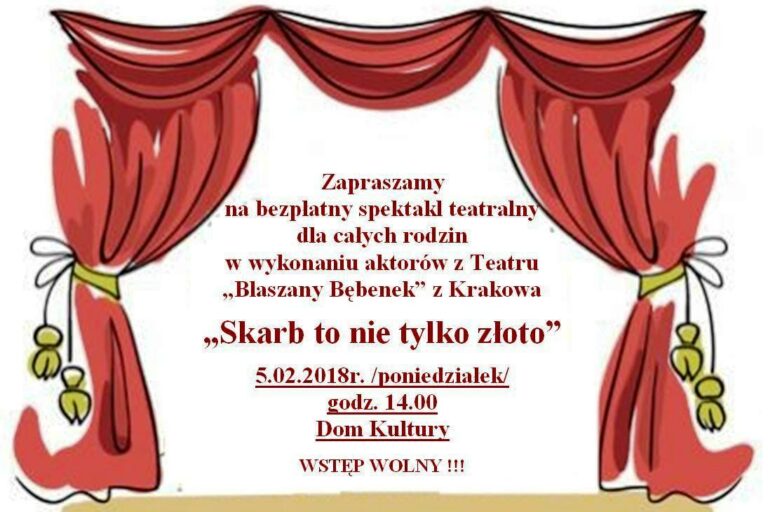 5.02.2018r. /poniedziałek/ godz. 14.00 – zapraszamy na bezpłatny spektakl teatralny „Skarb to nie tylko złoto”