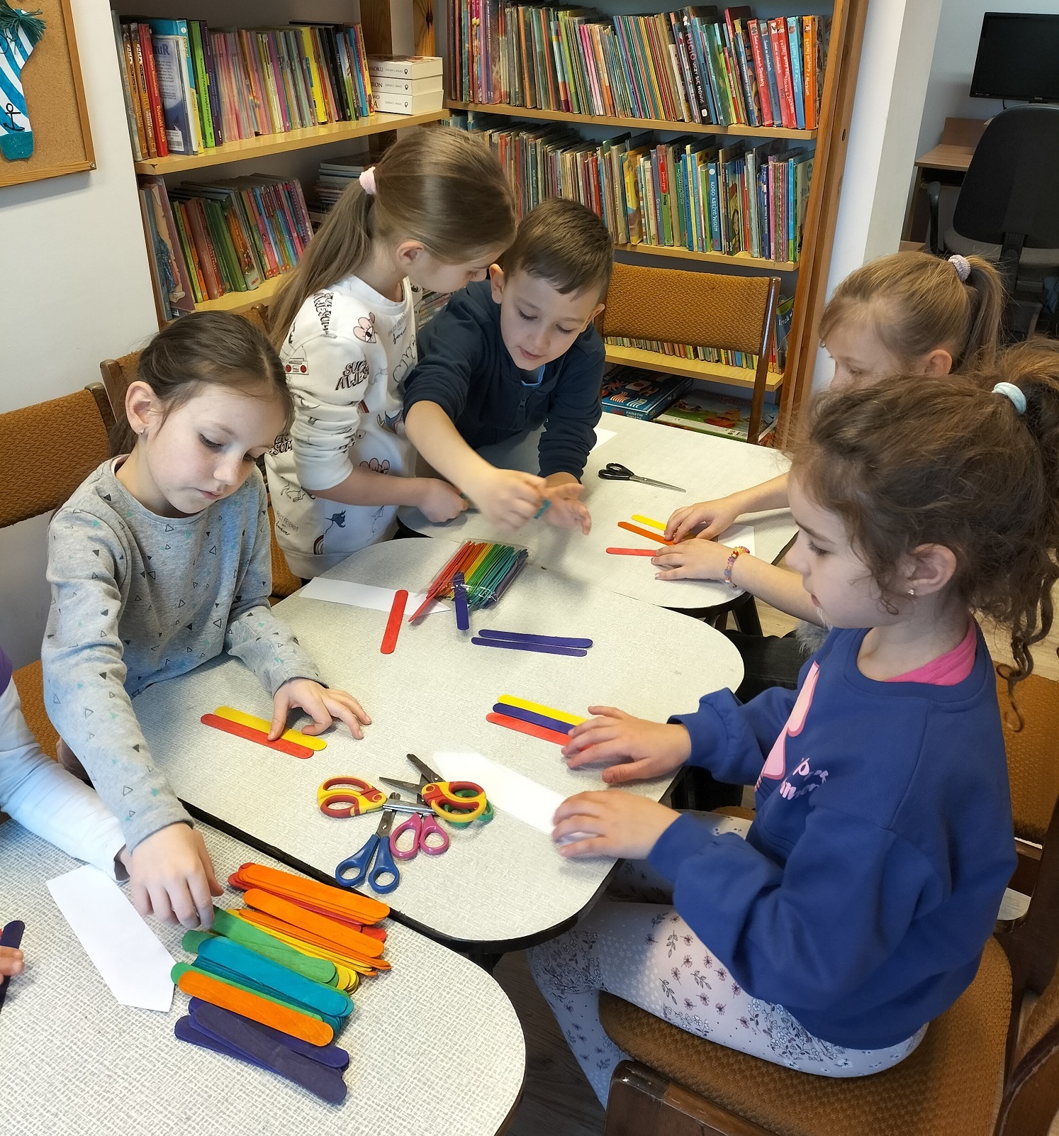 13.04.2023r. w Filii bibliotecznej w Kopkach uczniowie klasy I wzięli udział w zajęciach plastycznych, podczas których wykonali zakładki do książki z kolorowych drewnianych patyczków.