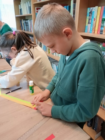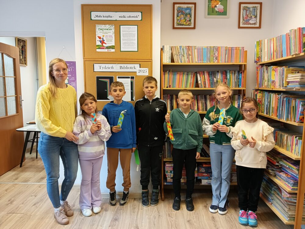 Dnia 12 maja podczas Tygodnia Bibliotek 2025 w Filii bibliotecznej w Kopkach odbyła się lekcja biblioteczna pt. „Książka moim przyjacielem” połączona z warsztatami tworzenia zakładki do książki. Dzieci z klasy II pod opieką Pani Marii Mila poprzez zabawy poznały różnorodne rodzaje książek, dowiedziały się w czym pomaga książka i jak o nią dbać, a także sprawdzili swoją wiedzę na temat popularnych baśni i bajek rozpoznając znane postacie bajkowe na ilustracjach. Na zakończenie drugoklasiści z kolorowych papierów wykonali piękne, plecione zakładki do swoich książek.
