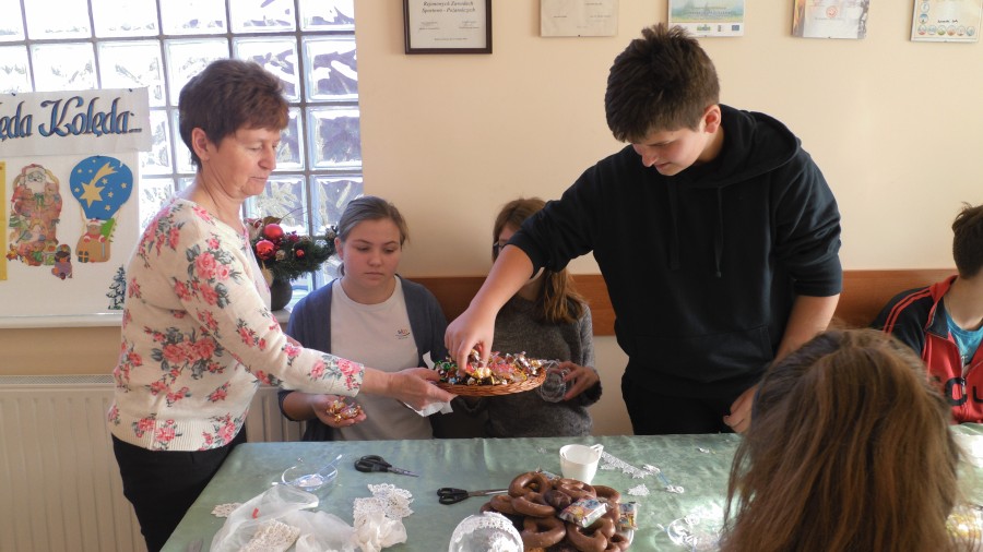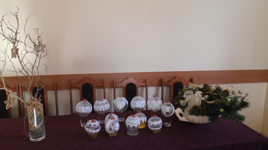 W spotkaniu uczestniczyli uczniowie kl. VI. i wychowawca kl. p. Teresa Młynarska. Na zaproszenie bibliotekarki zajęcia prowadziła p. Lucyna Rębacz, pod jej kierunkiem uczestnicy wykonali piękne koronkowe bombki. Miło spędzony czas zakończyły życzenia świąteczne oraz słodki poczęstunek.