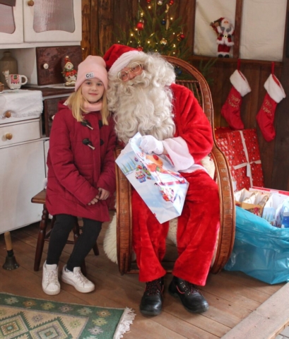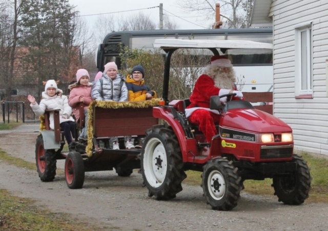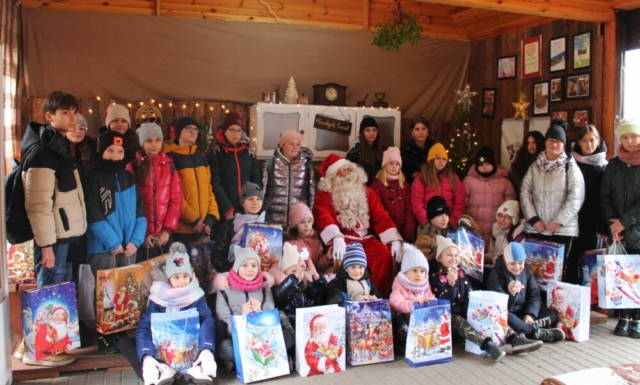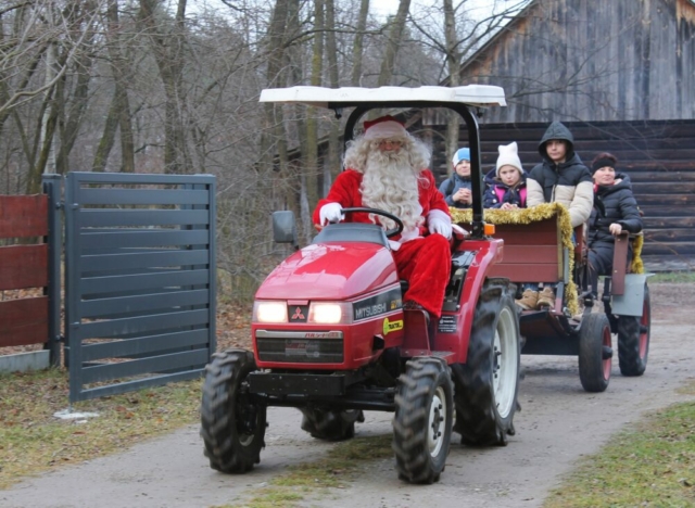 Po przyjeździe na miejsce zostaliśmy zaproszeni do specjalnie przygotowanej i świątecznie udekorowanej altany, gdzie z niecierpliwością czekaliśmy na przybycie św. Mikołaja. Długo wyczekiwany gość przyjechał na traktorku z przyczepką wypełnioną po brzegi prezentami. Wszystkie dzieci otrzymały wyjątkowe podarki i zrobiły sobie pamiątkowe zdjęcia. Spotkanie było pełne radości, uśmiechów i niezapomnianych emocji.