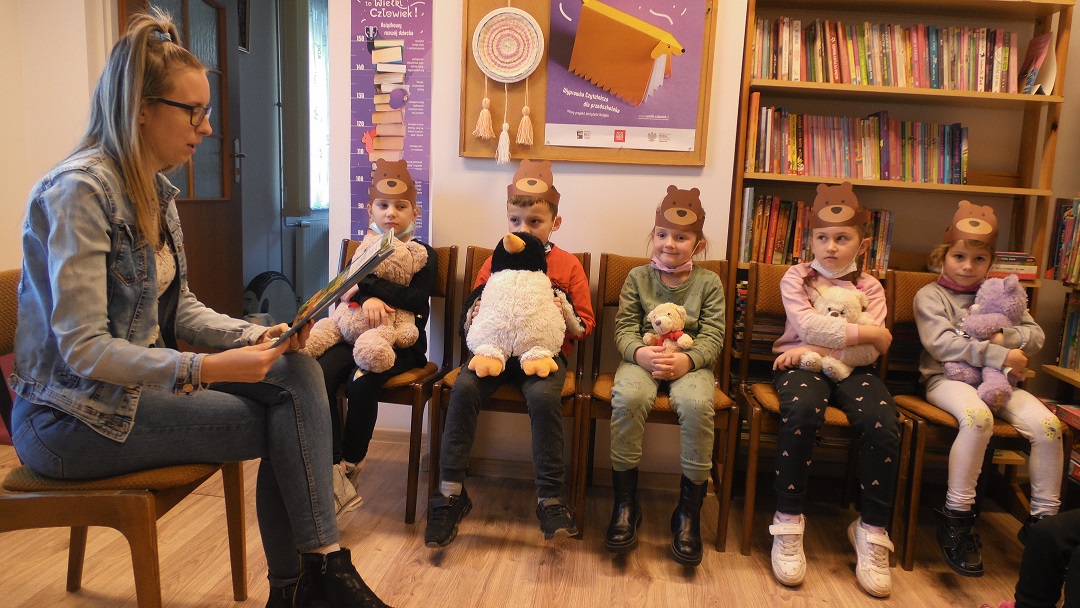 Na wspólne świętowanie urodzin misia przybyły dzieci z klasy „0” z p. Marzeną Trybowską z PSP w Kopkach. Maluchy przyniosły ze sobą ulubione pluszaki, o których bardzo chętnie opowiadały. Na wstępie Pani Bibliotekarka rozdała dzieciom misiowe opaski, które dla nich wykonała. W tracie spotkania odbyło się głośne czytanie książeczki pt. „Puchatkowe Zaklęcie” z serii Kubusiowych Opowieści Disneya. Dzieci uczciły ten dzień wspólną zabawą, która polegała na doczepianiu z zakrytymi oczami kokardek dużemu misiowi. Z dużym zaangażowaniem wykonały także laurki dla swoich pluszowych misiów. Na zakończenie otrzymały słodki poczęstunek w postaci ciasteczek.
