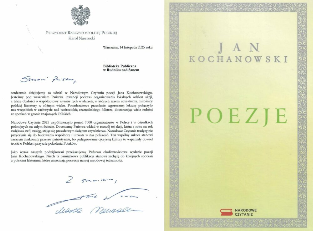 Biblioteka Publiczna w Rudniku nad Sanem otrzymała pamiątkowe wydanie zbioru poezji Jana Kochanowskiego w ramach podziękowania za udział w Narodowym Czytaniu 2025.