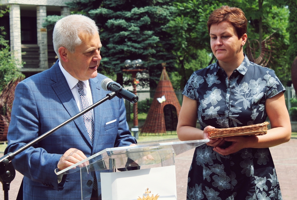 Zaproszonych gości przywitała Dyrektor Miejskiego Ośrodka Kultury Anna Straub, która podziękowała p. Marcinowi Jakubowskiemu za fachowe i artystyczne wykonanie wiklinowych artefaktów, Dyrektorowi Zespołu Szkół im. gen. Władysława Sikorskiego w Rudniku nad Sanem oraz Kierownikowi Warsztatów p. Markowi Wojtasiowi za wykonanie metalowych stelaży i konstrukcji, Pani Agacie Krasie – plastyczce, która wspólnie z p. Waldemarem Łojkiem zaprojektowała zabawki i artefakty. Słowa podziękowania skierowane zostały również do p. Edyty Lisek, która zajęła się adaptacją placu zabaw dla osób