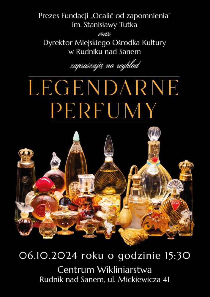 Prezes Fundacji „Ocalić od zapomnienia” im. Stanisławy Tutka oraz Dyrektor Miejskiego Ośrodka Kultury w Rudniku nad Sanem zapraszają na wykład LEGENDARNE PERFUMY