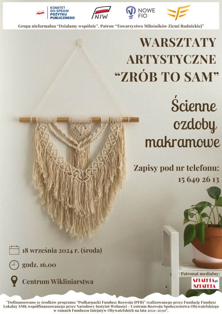 Grupa nieformalna „Działamy wspólnie” razem z patronem – Towarzystwem Miłośników Ziemi Rudnickiej zapraszają do udziału w kolejnych bezpłatnych warsztatach realizowanych w ramach inicjatywy „Warsztaty artystyczne – zrób to sam”, podczas których będzie można wykonać z makramy dekoracje ścienne. Zajęcia ponownie poprowadzi pani Anita Ryba.