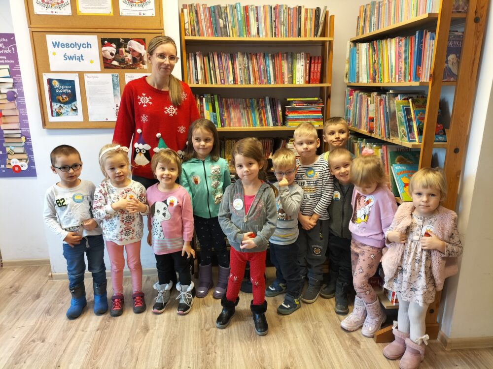 W dniu 19.12.2023r. Filię biblioteczną w Kopkach odwiedziły przedszkolaki pod opieką Pani Eweliny Świta. Podczas zajęć odbyło się głośne czytanie świątecznej książeczki dla dzieci pt. „Gwiazdka Miko” oraz zabawa pt. „Kim jestem”, podczas której dzieci otrzymały naklejki.