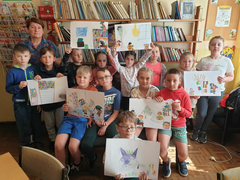 Dzieci opowiadały jak wyobrażają sobie bibliotekę w przyszłości i wykonały plakat pt. „Kącik małego czytelnika”. Uczniowie otrzymali kolorowe zakładki do książek.
