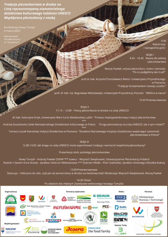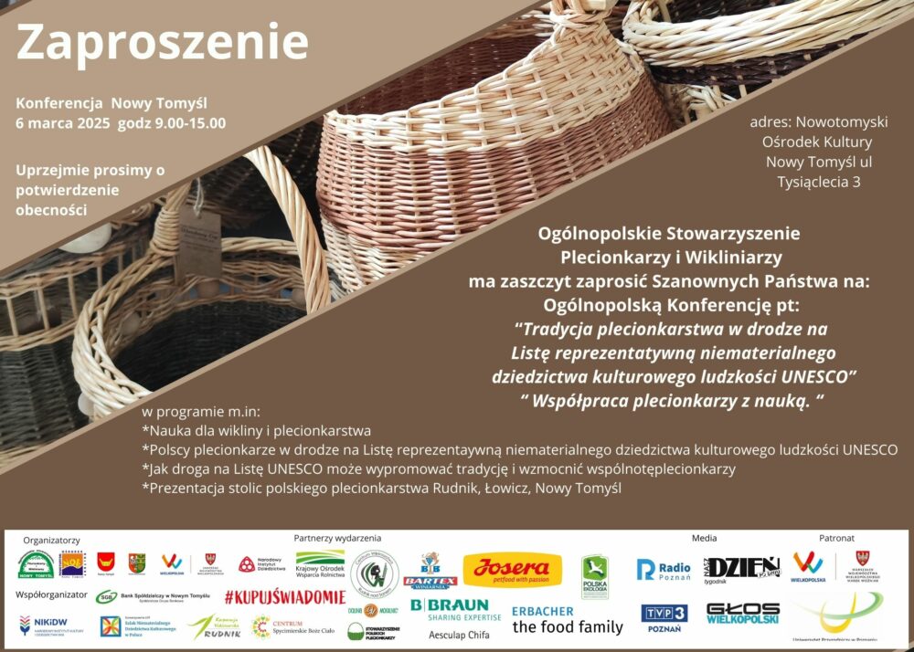Burmistrz Gminy i Miasta Rudnik nad Sanem oraz Dyrektor Miejskiego Ośrodka Kultury, na zaproszenie Ogólnopolskiego Stowarzyszenia Plecionkarzy i Wikliniarzy, wezmą udział w ogólnopolskiej konferencji pt. „Tradycja plecionkarstwa w drodze na Listę reprezentatywną niematerialnego dziedzictwa kulturowego ludzkości UNESCO. Współpraca plecionkarzy z nauką.” organizowanej w czwartek 06 marca 2025 r. w Nowym Tomyślu.