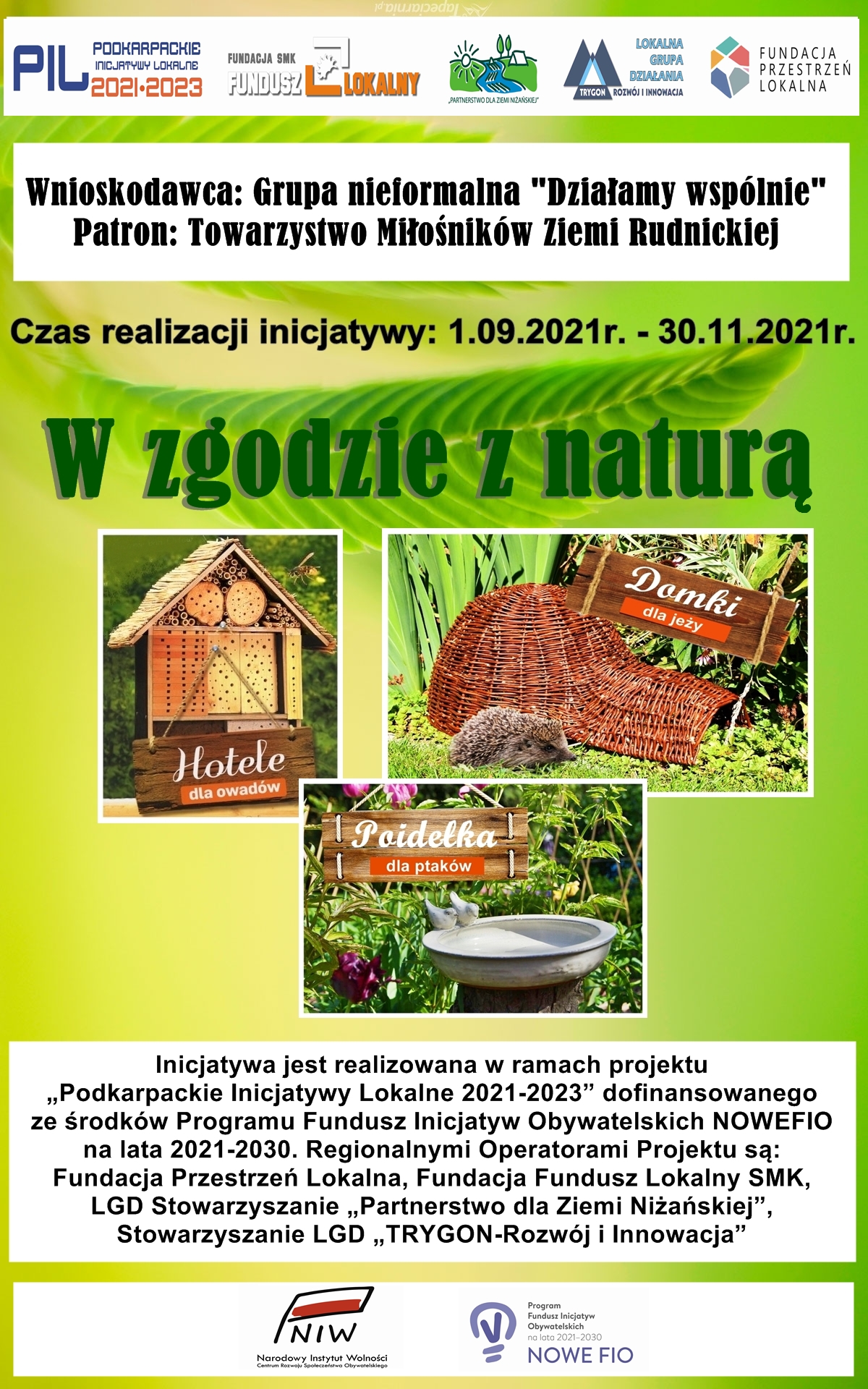 Grupa nieformalna „Działamy wspólnie”, składająca się z pracowników Miejskiego Ośrodka Kultury oraz Patron Towarzystwo Miłośników Ziemi Rudnickiej realizują projekt „W zgodzie z naturą”. Inicjatywa jest realizowana w ramach projektu „Podkarpackie Inicjatywy Lokalne 2021 -2023” dofinansowanego ze środków Programu Fundusz Inicjatyw Obywatelskich NOWEFIO na lata 2021 – 2030. Regionalnymi Operatorami Projektu są: Fundacja Przestrzeń Lokalna,Fundacja Fundusz Lokalny SMK, Stowarzyszenie LGD „Partnerstwo dla Ziemi Niżańskiej”, Stowarzyszenie LGD „TRYGON – Rozwój i Innowacja”. W ramach projektu wyznaczone zostaną eco – strefy oraz zorganizowane będą warsztaty, podczas których powstaną: hoteliki dla owadów, poidełka dla ptaków oraz domki dla jeży. Uczestnikami inicjatywy będą dzieci z terenu Gminy Rudnik nad Sanem.