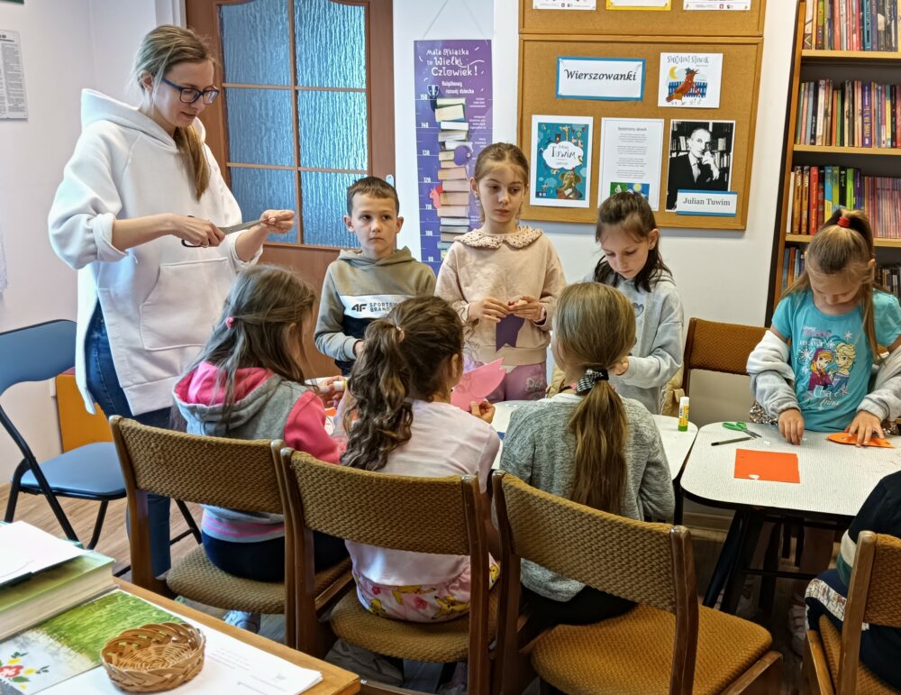 07.05.2024r. w Filii bibliotecznej w Kopkach odbyły się zajęcia plastyczne inspirowane wierszem Juliana Tuwima „Spóźniony słowik”. Klasa II pod opieką wychowawczyni Pani Marii Pająk wysłuchała czytanego przez bibliotekarkę wiersza o niepunktualnym ptaszku oraz wykonała kolorowe słowiki z papieru.