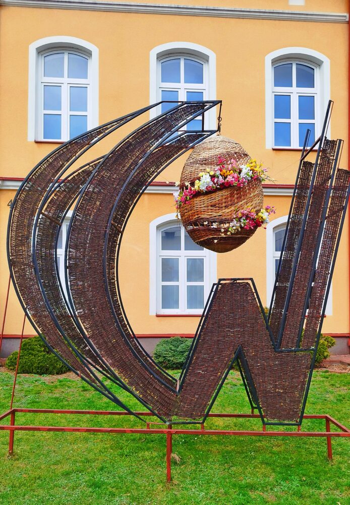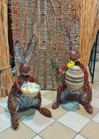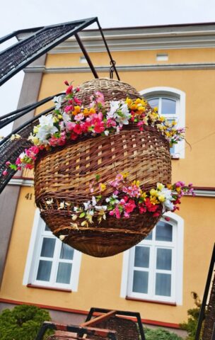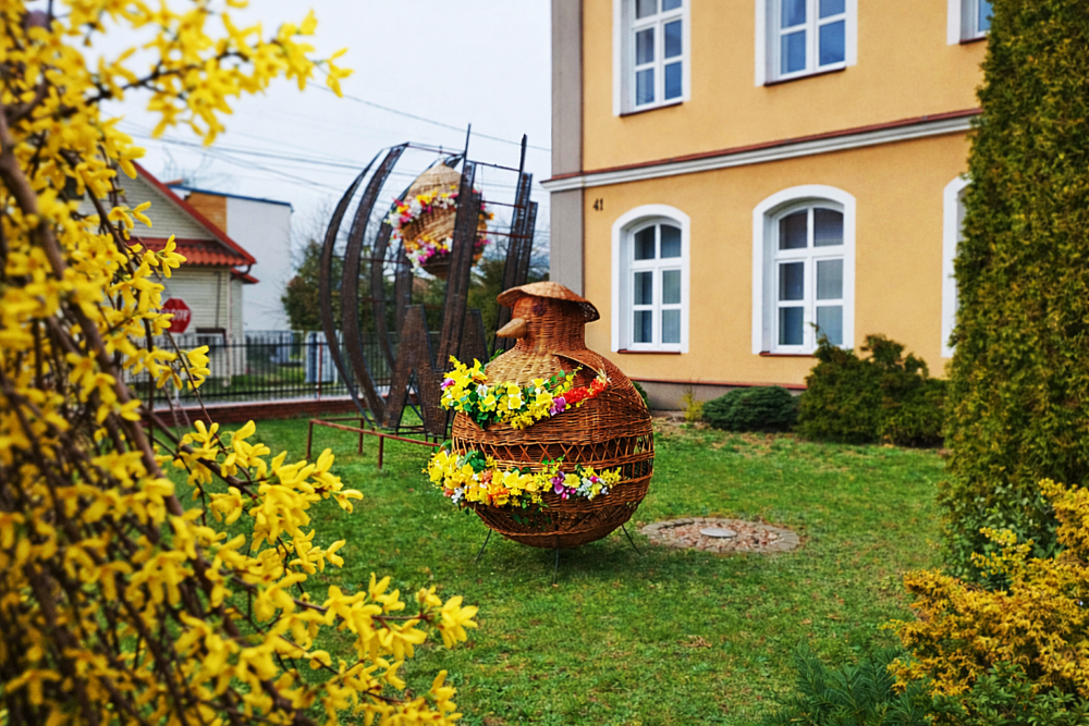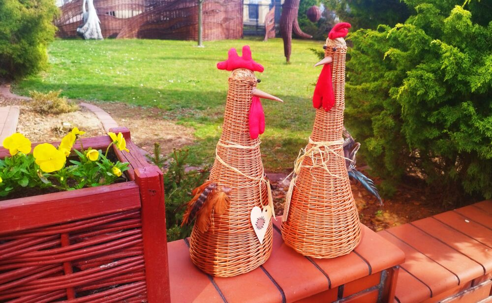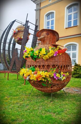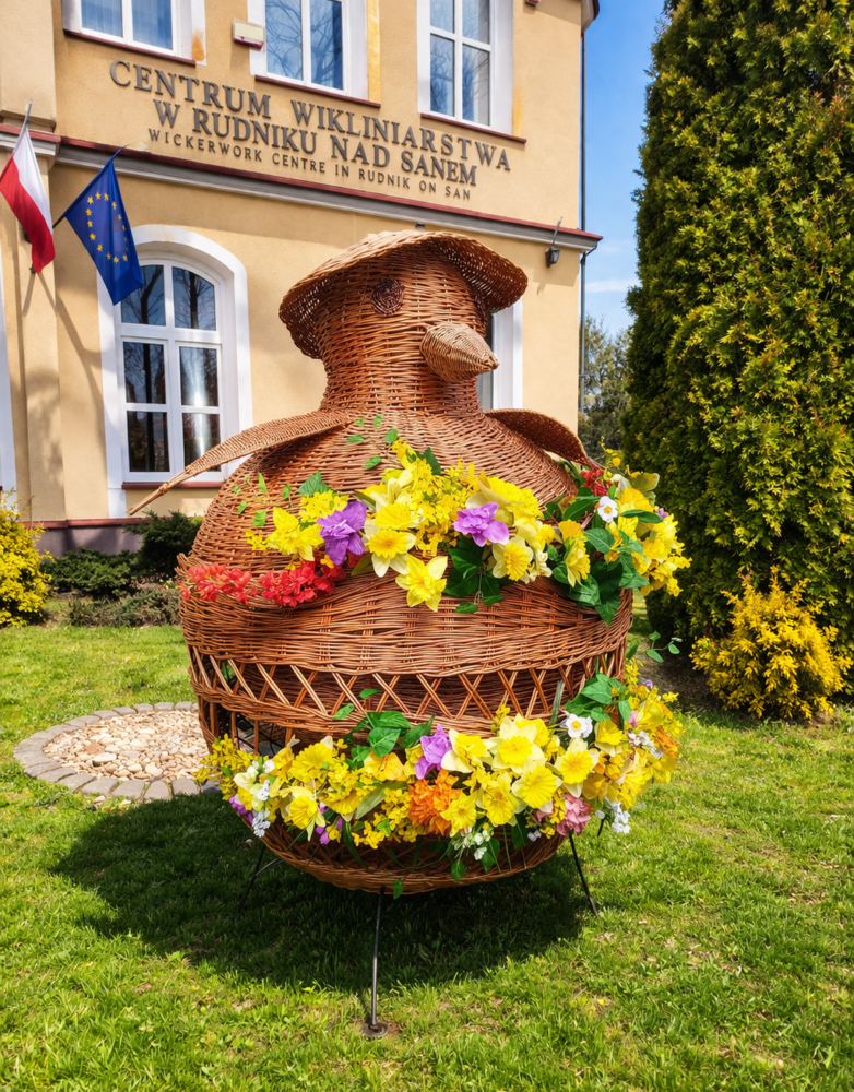 Przed Centrum Wikliniarstwa pojawił się urokliwy, wiklinowy kurczak, który dumnie wita wszystkich odwiedzających i wprowadza w radosny, świąteczny nastrój. Tuż obok można podziwiać piękne wiklinowe jajo, ozdobione kwiatami 🌼, które stanowi prawdziwy przykład rękodzielniczego kunsztu i podkreśla tradycyjny charakter dekoracji.