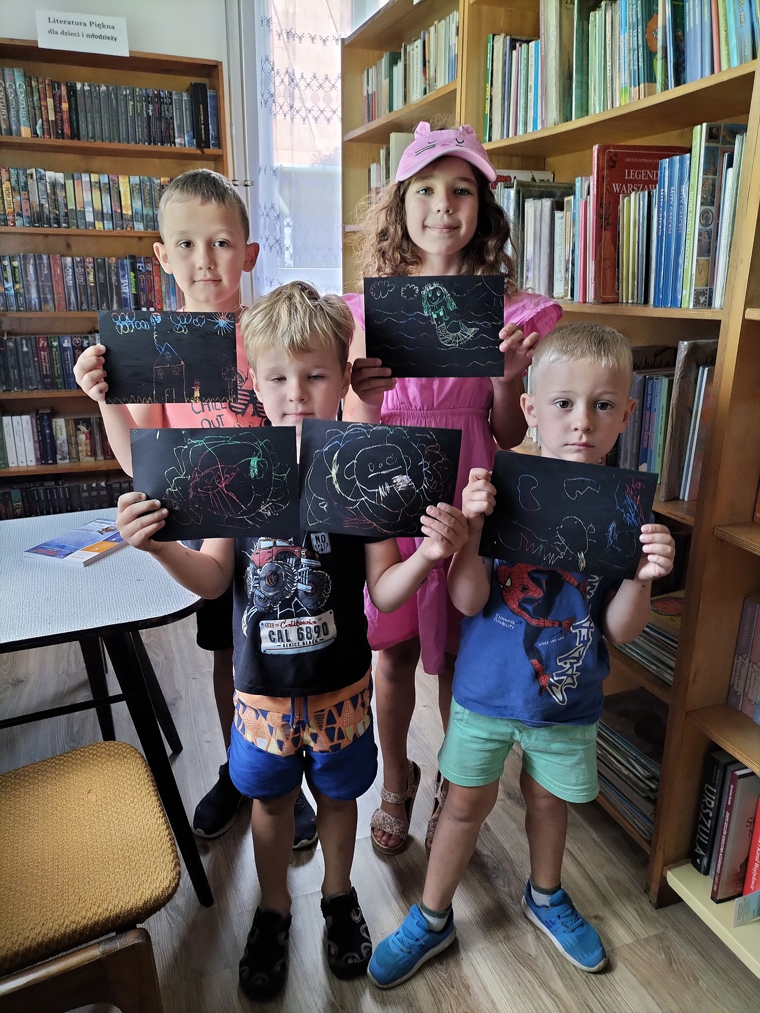 W okresie wakacyjnym, dnia 11.08.2023r. w Filii bibliotecznej w Kopkach odbyły się zajęcia plastyczne. Dzieci za pomocą pasteli olejnych oraz czarnej farby samodzielnie wykonały prace techniką wydrapywanki, a następnie zdrapując czarną warstwę farby przy pomocy drewnianych patyczków tworzyli kolorowe obrazki.