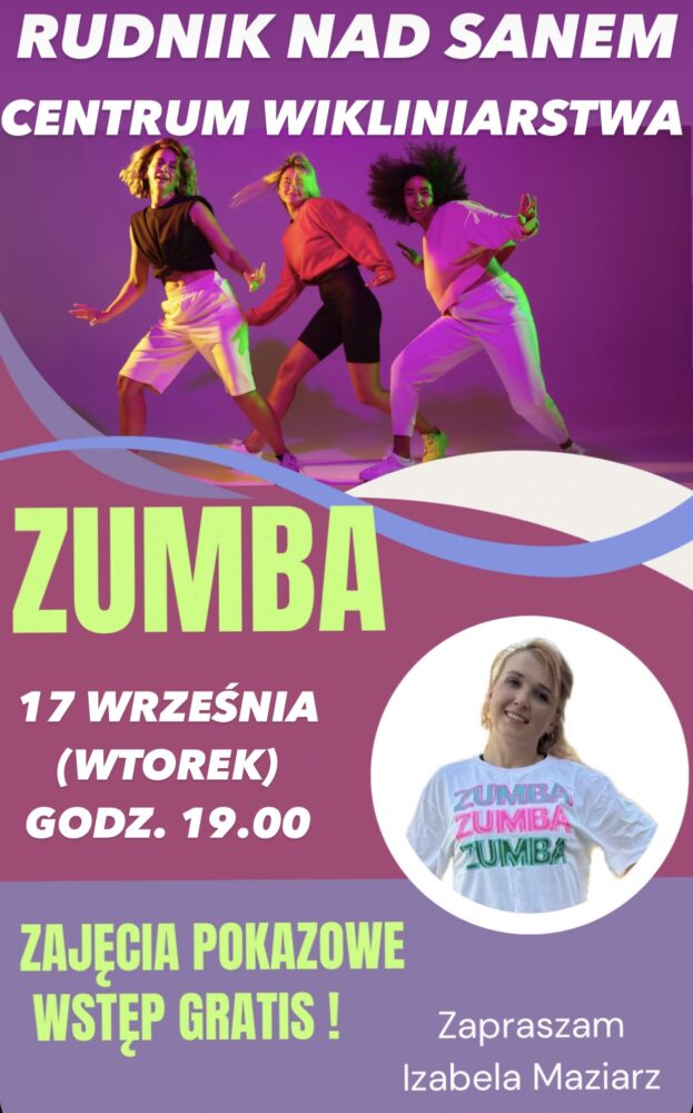 Nowy termin! 17 września 2024 r. (wtorek) o godz. 19.00 zapraszamy do Centrum Wikliniarstwa na pierwsze pokazowe zajęcia zumby. Wstęp gratis!