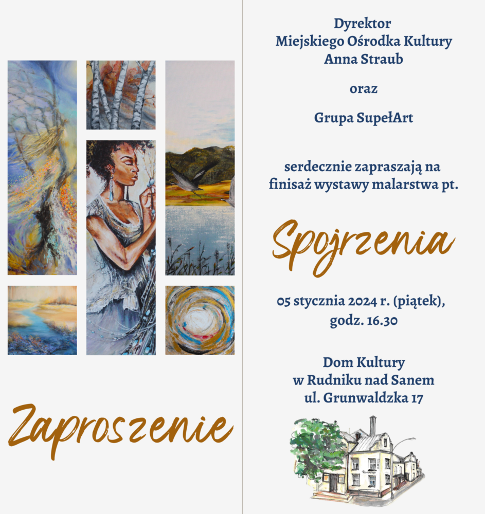 📣📣 Serdecznie zapraszamy na godz. 16.30 do Domu Kultury na jutrzejszy finisaż wystawy malarstwa pt. „Spojrzenia” autorstwa Grupy SupełArt. Na gości czekać będzie słodki poczęstunek.
