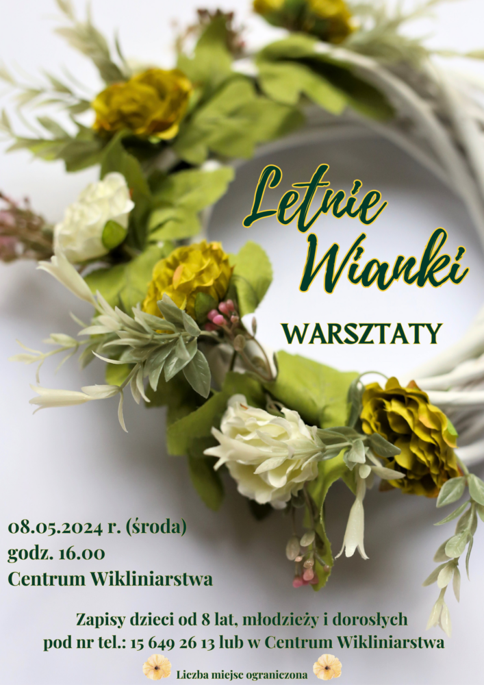 Zapraszamy na bezpłatne warsztaty tworzenia letnich wianków, które poprowadzi pani Anna Śliwka. Gotowymi ozdobami będzie można udekorować np. drzwi wejściowe domostw.