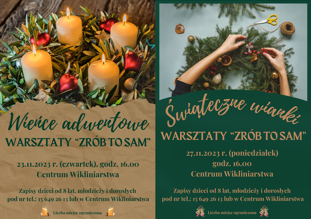Jeśli chcecie własnoręcznie wykonać jedyne w swoim rodzaju dekoracje, to serdecznie zapraszamy na bezpłatne warsztaty pod hasłem „zrób to sam”, podczas których będzie mogli stworzyć wieńce adwentowe i świąteczne wianki. Poprowadzi je tak, jak poprzednio pani Anna Śliwka.