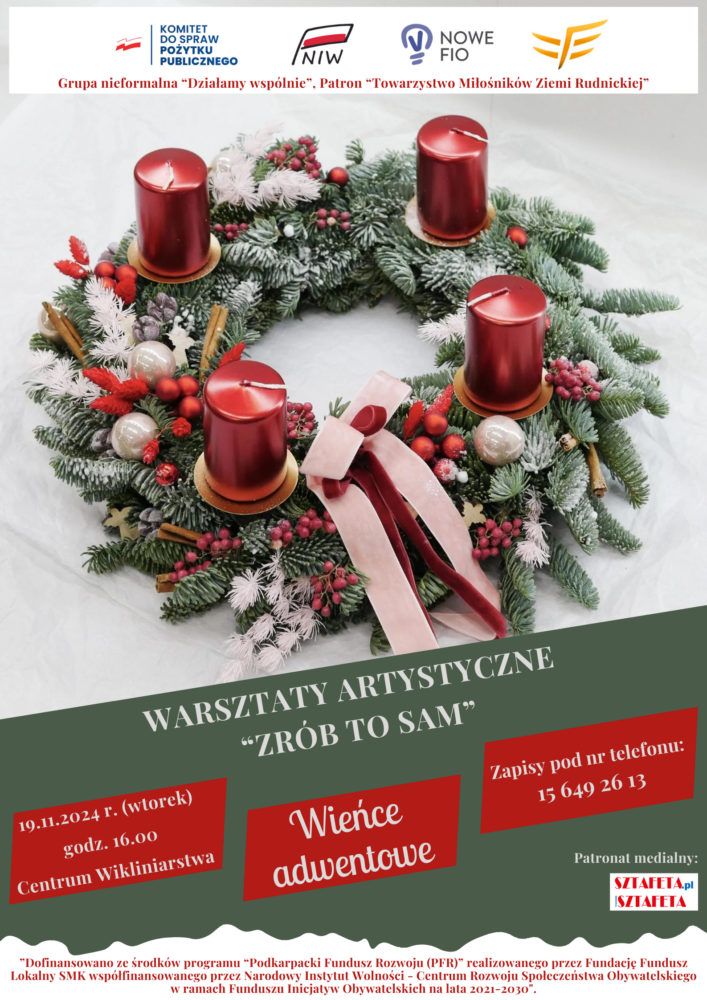 Grupa nieformalna „Działamy wspólnie” razem z patronem – Towarzystwo Miłośników Ziemi Rudnickiej zapraszają do udziału w bezpłatnych warsztatach tworzenia wianków adwentowych w ramach inicjatywy „Warsztaty artystyczne – zrób to sam”. Zajęcia poprowadzi pani Anna Seroka-Szoja.