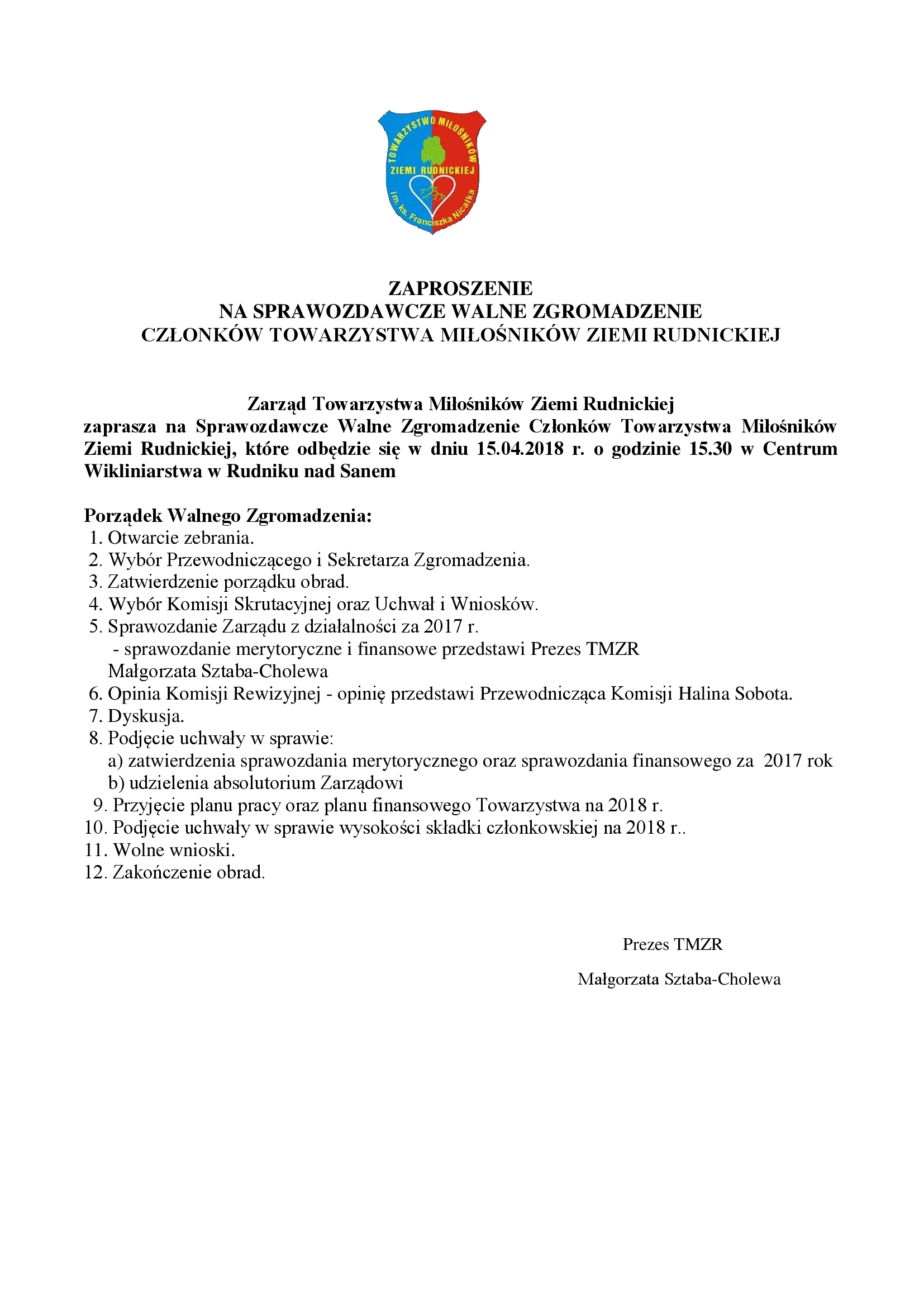 ZAPROSZENIE NA SPRAWOZDAWCZE WALNE ZGROMADZENIE CZŁONKÓW TOWARZYSTWA MIŁOŚNIKÓW ZIEMI RUDNICKIEJ