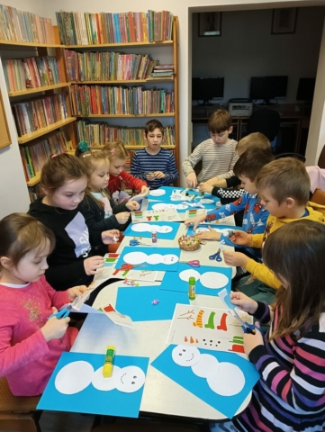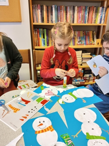 27 stycznia 2025r. w Fili bibliotecznej w Kopkach odbyły się zimowe zajęcia dla klasy I z Publicznej Szkoły Podstawowej im. ks. Jerzego Popiełuszki. Dzieci wraz z wychowawczynią Panią Marzeną Grzybowską wysłuchały treści książeczki pt. „Kicia Kocia. Zima” Anity Głowińskiej, która opowiada o niesamowitych przygodach małej kotki w trakcie zimy oraz wykonały bałwanki – wycinanki.