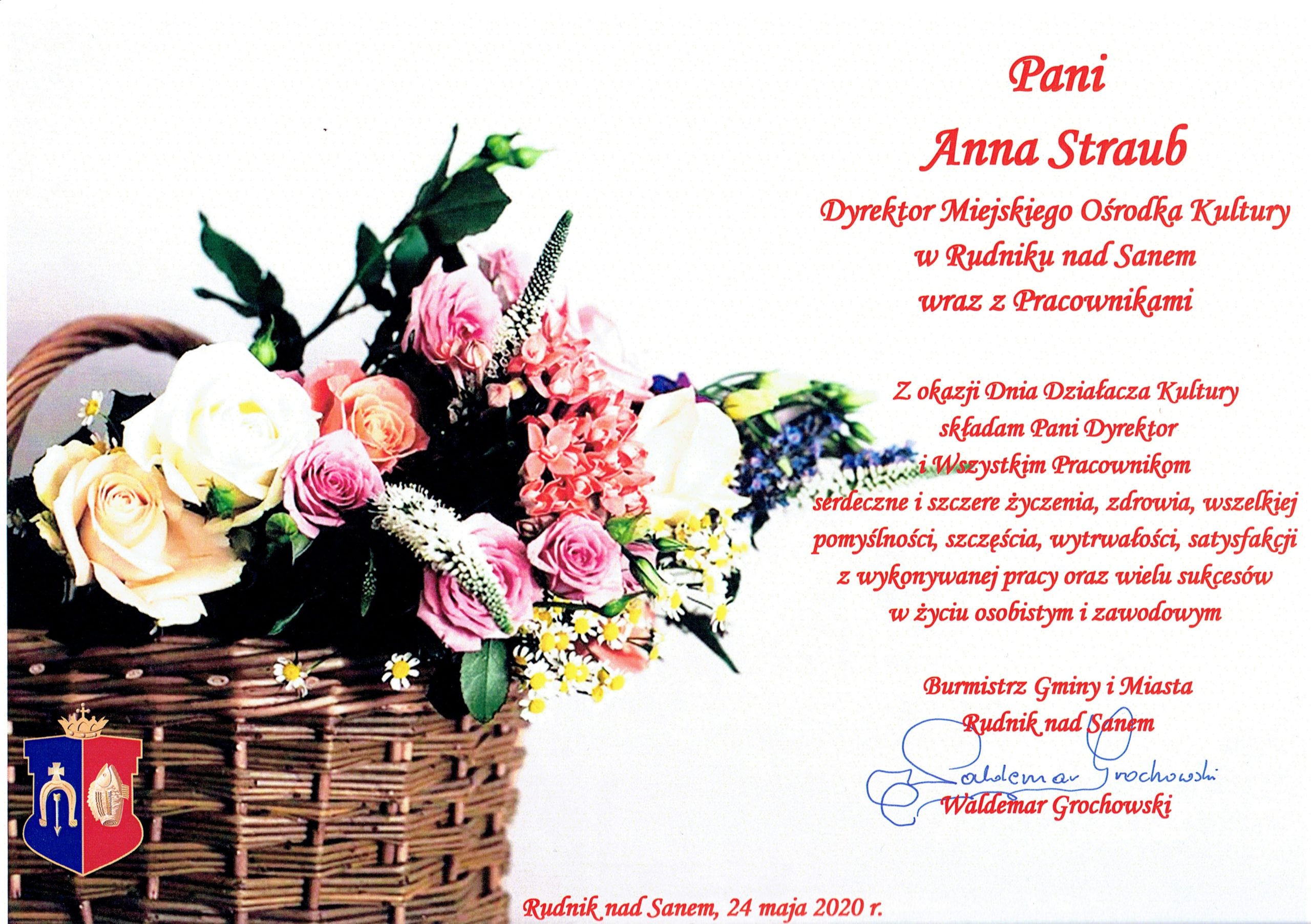 Życzenia od Burmistrza Waldemara Grochowskiego z okazji Dnia Działacza Kultury